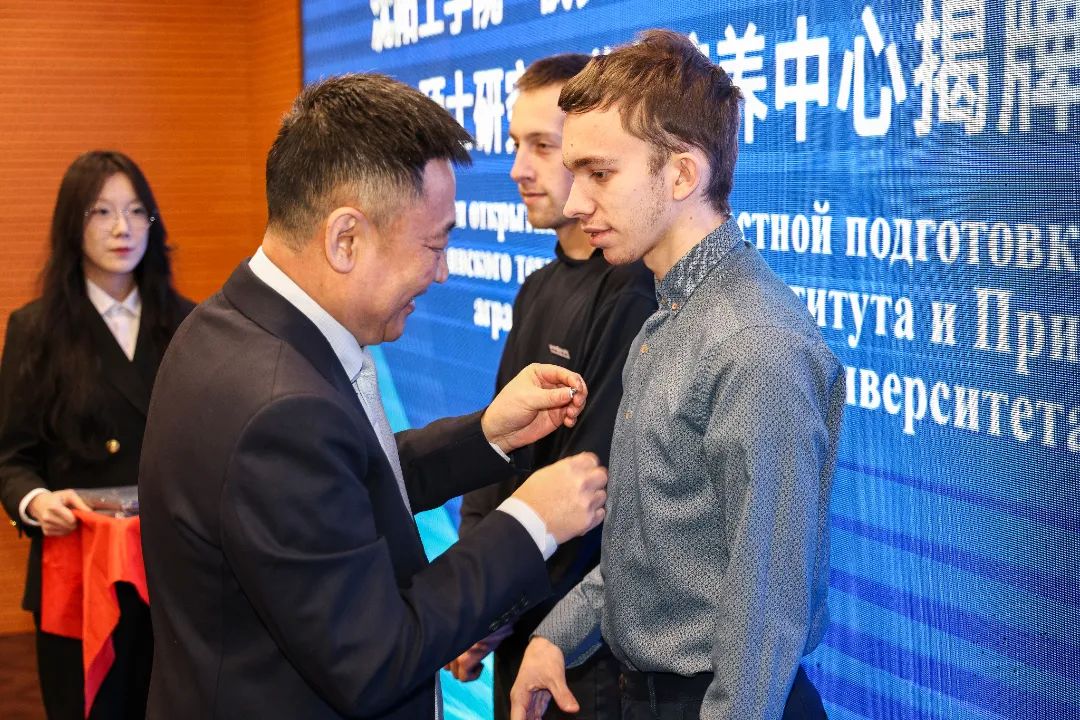 仪式上,王兆宝与波洛金·伊戈尔·伊戈列维奇共同为中心揭牌。王兆宝为来自滨海国立农业技术大学的两位硕士学生佩戴沈阳工学院徽章并送上沈阳工学院文化衫。波洛金·伊戈尔·伊戈列维奇为我校教师颁发俄罗斯滨海国立农业技术大学聘任硕士导师校长令。李康举为滨海国立农业技术大学教师颁发聘书。