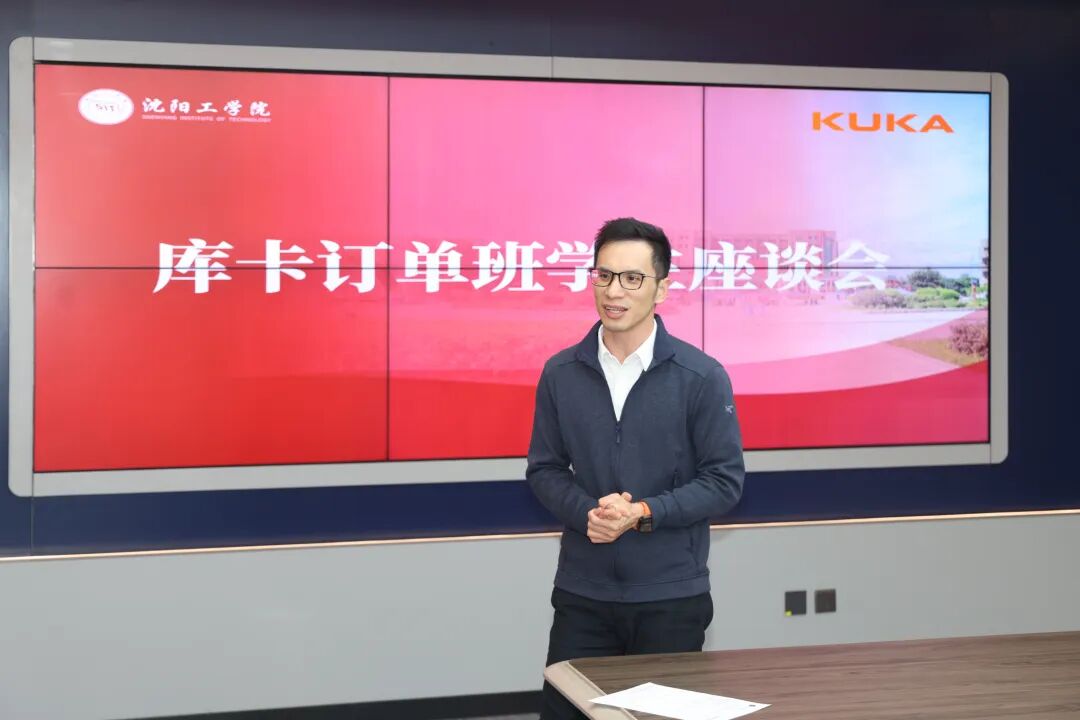 库卡中国教育行业部部长陈宏介绍了库卡中国发展概况。拥有127年发展积淀的库卡集团,自成为美的集团全资子公司以来,依托美的雄厚资源与全球网络布局,深耕中国市场,聚焦本地化、全球化、多元化与数字化战略。作为工信部认定的机器人产业链“链主”企业,库卡中国积极推进核心零部件国产化进程,业务覆盖工业机器人、自动化解决方案、智慧物流、医疗科技等多个关键领域,服务宝马、特斯拉等全球知名企业。值得关注的是,沈阳工学院是国内唯一在学校内全面配置并规模化应用库卡全系列产品的院校,这一独特优势彰显了双方长期以来深厚的合作根基。