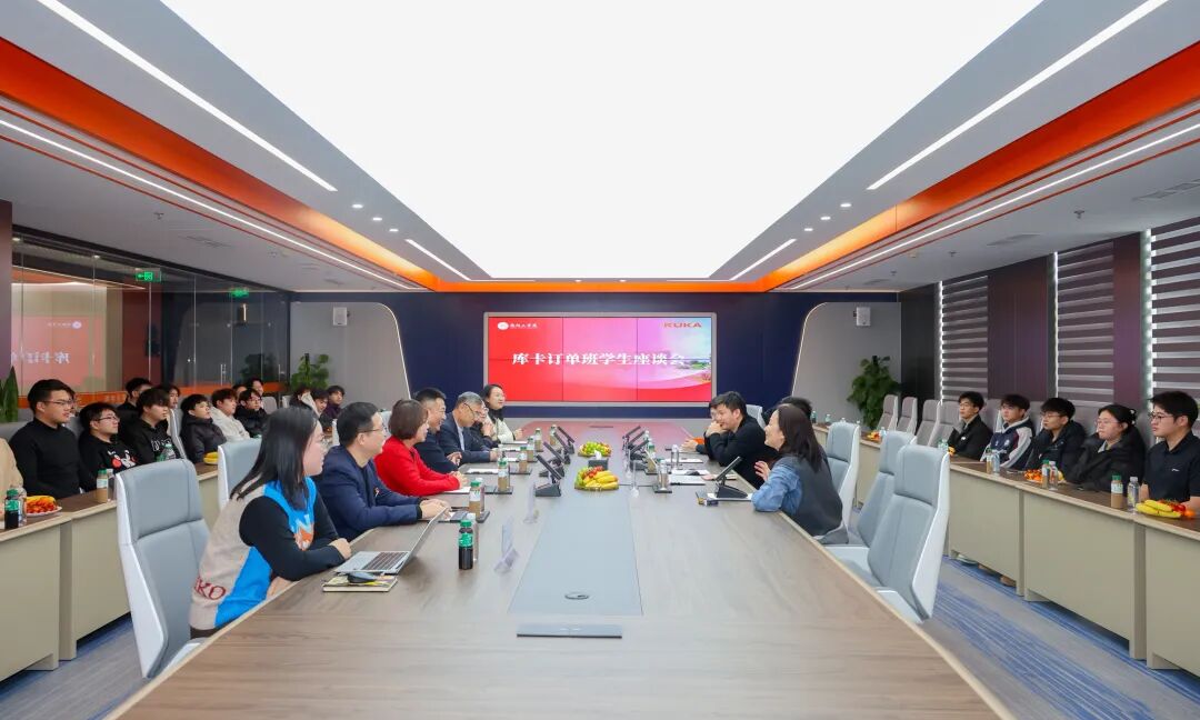 在库卡订单班学生座谈互动环节,同学们围绕个人能力培养、职业发展路径、企业工作环境、课程体系优化及晋升通道建设等问题踊跃提问。库卡中国汽车自动化总经理薛严以“能力是基础,认知是高度”为核心,分享了职业成长的核心逻辑;库卡HRBP总监张宇翔结合自身职业发展经历,介绍了库卡广阔多元的发展前景,为学子们的职业规划提供了宝贵参考。