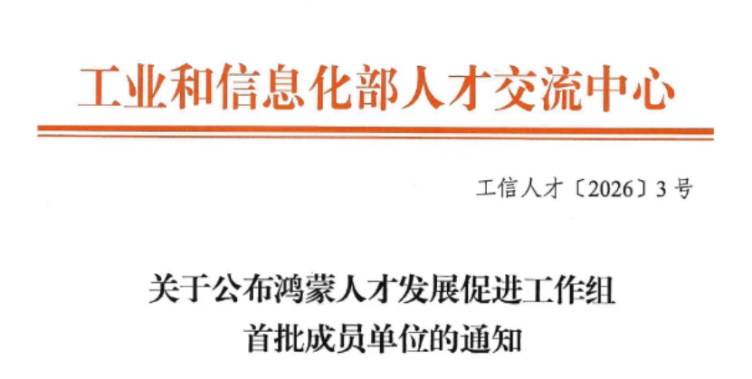 近日,工业和信息化部人才交流中心发布《关于公布鸿蒙人才发展促进工作组首批成员单位的通知》(工信人才[2026]3号),我校成功入选。这一成果既是对学校产教融合工作的高度认可,也标志着我校在服务国家信息技术应用创新战略、培育鸿蒙生态专业人才方面取得重要进展。
