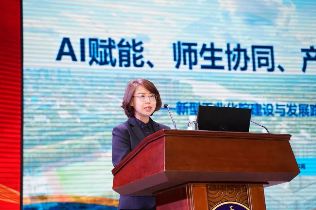 会上,徐颖以《AI赋能、师生协同、产教融合》为题作新型工业化院建设与发展路径报告。从背景与意义、定位与使命、赋能与共赢三个方面深入介绍了新型工业化院的建设思路与发展规划。新型工业化院的核心打法是“三个一”工程,让教师实现从“教书匠”到“双师型专家”的转变。让学校实现从“办学”到“共生”,打造区域战略平台。