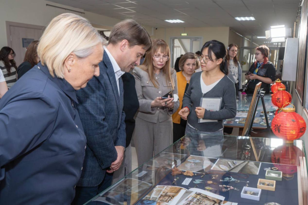 作为此次访学的“重头戏”,我校访学团队精心策划的《植物里的故事集》文创作品交流展在克麦罗沃国立文化学院展厅隆重开展,成为两校文化艺术交流的重要亮点。展览共展出我校学生创作的40余件作品,涵盖定格植物肌理的标本画、摆台首饰、植物认知教具和蓝染工艺文创等多个品类。这些作品以中国传统植物文化为创作核心,融入现代设计理念,植物纹样的蓝染丝巾等作品兼具文化内涵与实用价值。俄方高度重视此次展览,特别邀请库兹巴斯美术博物馆副主任玛丽娜·尤里耶夫娜·切尔托戈娃、“托马斯克书写家”自然保护区博物馆馆长马克西姆·维克托罗维奇·戈洛文出席并致辞。展览作品以独特的创意视角和鲜明的文化特色,赢得俄方嘉宾及师生的高度评价,充分展现了我校艺术专业学生的创作实力与创新思维。