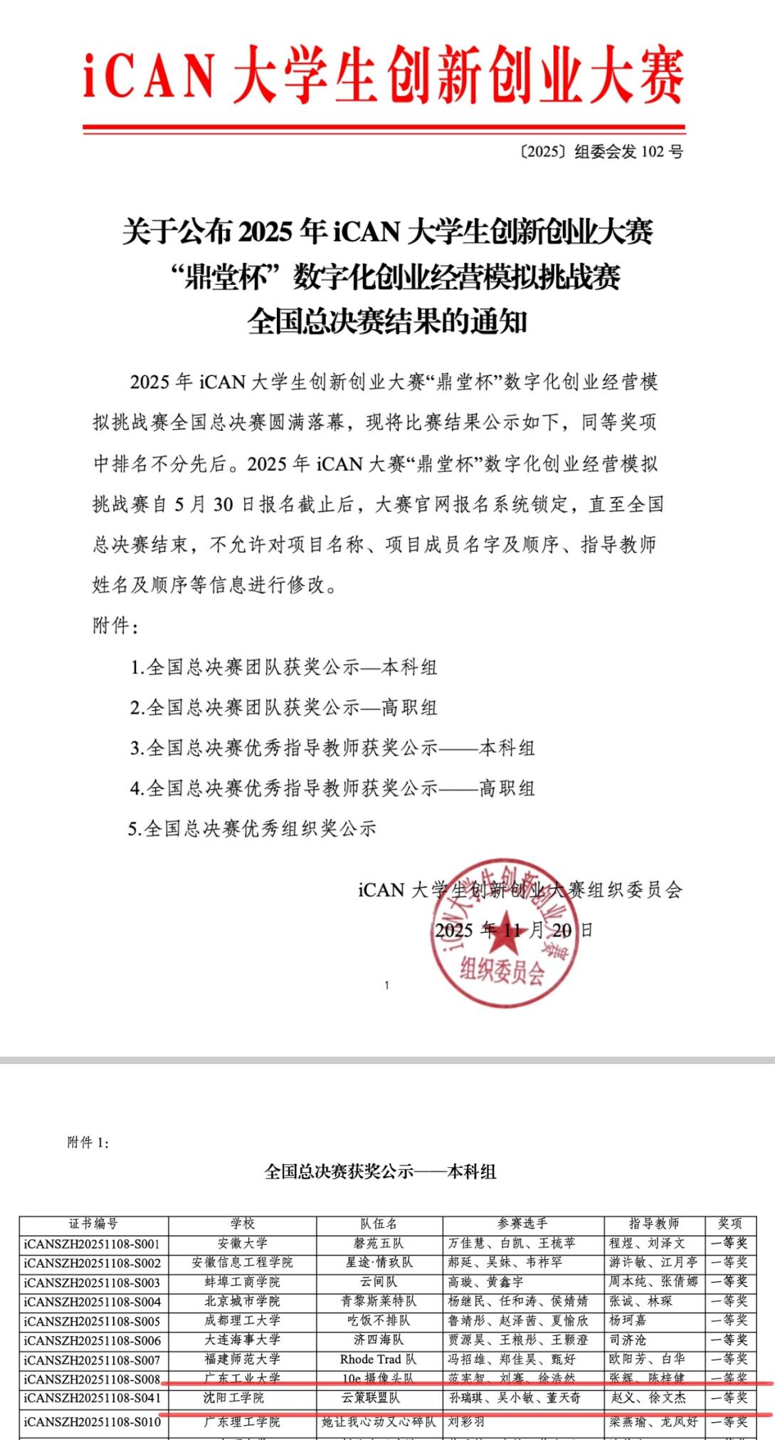近日,2025年iCAN大学生创新创业大赛“鼎堂杯”数字化创业经营模拟挑战赛全国总决赛暨经管学科数智化教学改革研讨会在四川师范大学圆满落幕。我校学生孙瑞琪、吴小敏和董天奇组成的参赛团队,从全国2万余名参赛者、137支全国总决赛队伍中脱颖而出,成功斩获全国一等奖,指导教师赵义、徐文杰获评“优秀指导老师”称号。