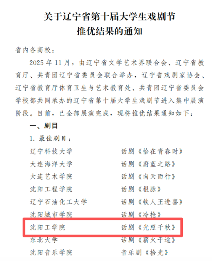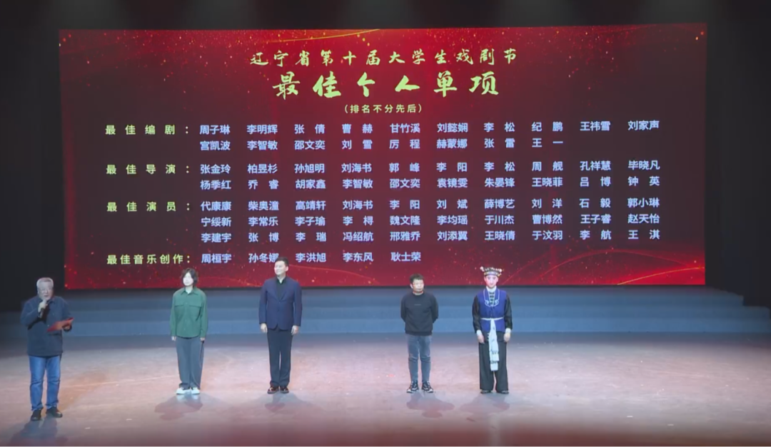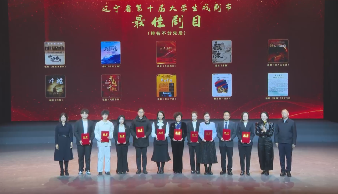 10月29日,由辽宁省教育厅、共青团辽宁省委员会、辽宁省文学艺术界联合会联合主办的辽宁省第十届大学生戏剧节闭幕式在沈阳音乐学院圆满落幕。我校原创话剧《光照千秋》一举斩获最佳剧目奖(最高奖项),还包揽最佳导演、最佳编剧、最佳演员、优秀演员、优秀指导教师、优秀组织单位等六项荣誉,成为本届戏剧节最大亮点之一,还作为优秀剧目受邀亮相闭幕式展演。这是艺术与传媒学院表演系首次斩获省级剧目大奖,实现历史性突破!