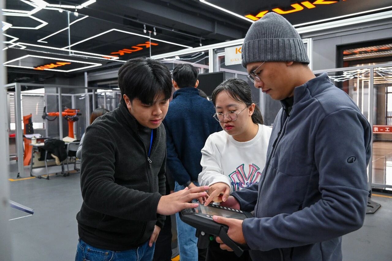 本次研学活动聚焦专业能力提升与文化深度交流,为泰国师生量身打造了系统化的学习体验。在专业研习环节,教学全程采用全英文授课模式,紧密对接泰国先皇理工大学的专业培养目标,课程内容涵盖工业机器人、PLC、华为ICT、人工智能、美的数字化管理、工业互联网及无人机航测等多个前沿技术领域。访学团师生深入库卡授权工业机器人学院、西门子学院等现代产业学院,累计完成72学时的系统学习,沉浸式感受我校在产教融合方面的鲜明特色与丰硕成果,切实提升了专业认知与实践能力。