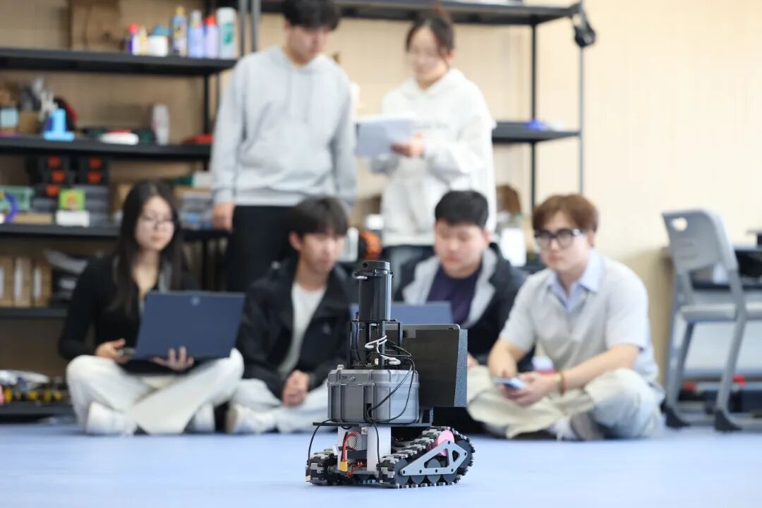 “同学们想让技术服务生活!”电子信息工程专业学生李思锋在央视采访中说。团队基于鸿蒙开源框架打造的环境监测小车,可实现数据采集、分析与上传,能服务图书馆环境监控、智慧农业监测等场景,成功登上央视报道银幕,成为学校项目化教学的标志性成果。实验室里,智能安防机器人、多场景智能机器人等作品有序运行,每一台设备都是学生“在做中学、在研中创”的鲜活见证。