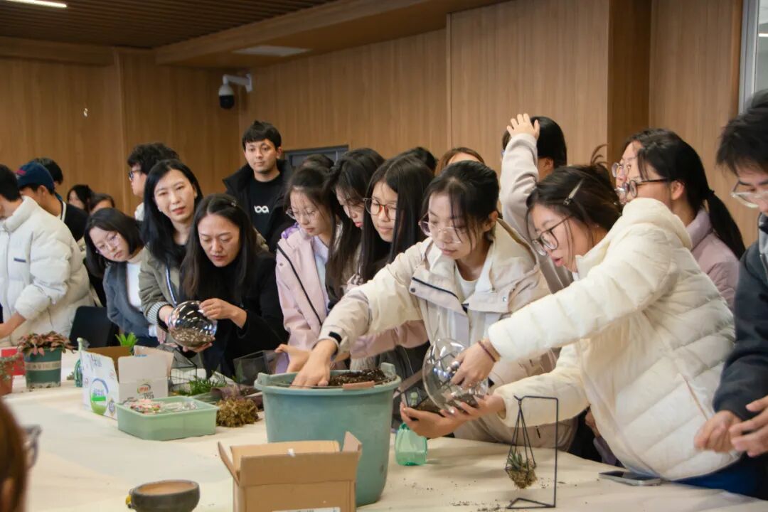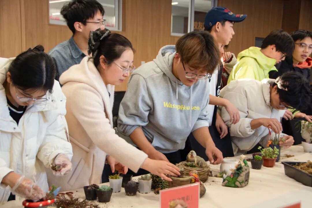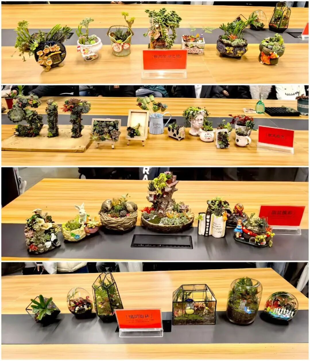活动伊始,现场气氛便热烈非凡。新生同学们以小组为单位,围绕四大创意主题展开了紧张的创作。“璃间雨林”主题区,同学们利用苔藓、蕨类植物,在玻璃花房中筑出湿润荫蔽的雨林微景观;“欧风植艺”主题区,柔美的藤蔓植物与硬朗的铁艺框架巧妙结合,展现了垂直绿化的艺术美感;“脂盆簇彩”主题区,以树脂花盆为器,巧妙搭配出一个个萌趣可爱的“迷你花园”;“釉间花,球之境”主题区,各种仙人球与多浆植物错落有致地安置在雅致的瓷器中,呈现出独特的沙漠风情。在整个造景过程中,同学们热情投入,将课堂所学的植物学知识与艺术审美完美融合。园艺专业的教师们穿梭于各小组之间,从植物配置、色彩搭配到构图技巧,给予了细致入微的现场指导,让同学们在实践中深化了对专业的理解。